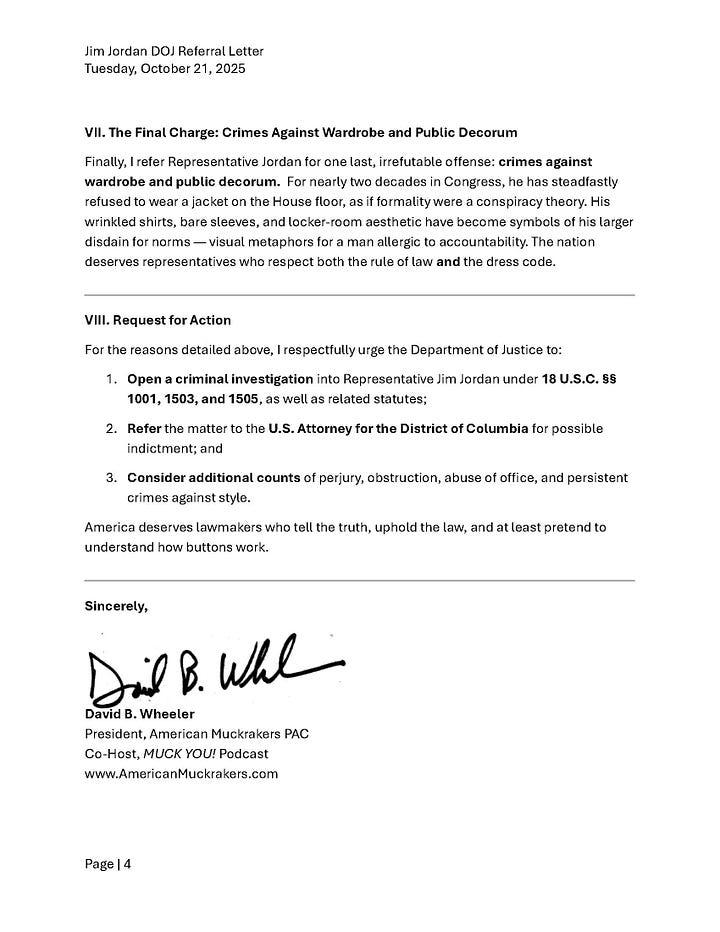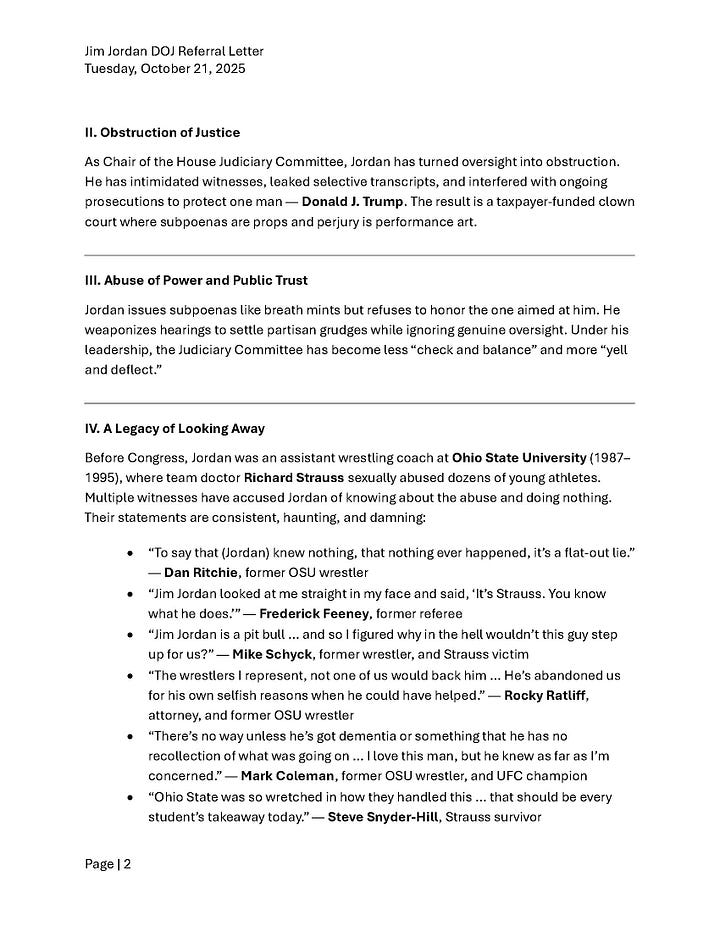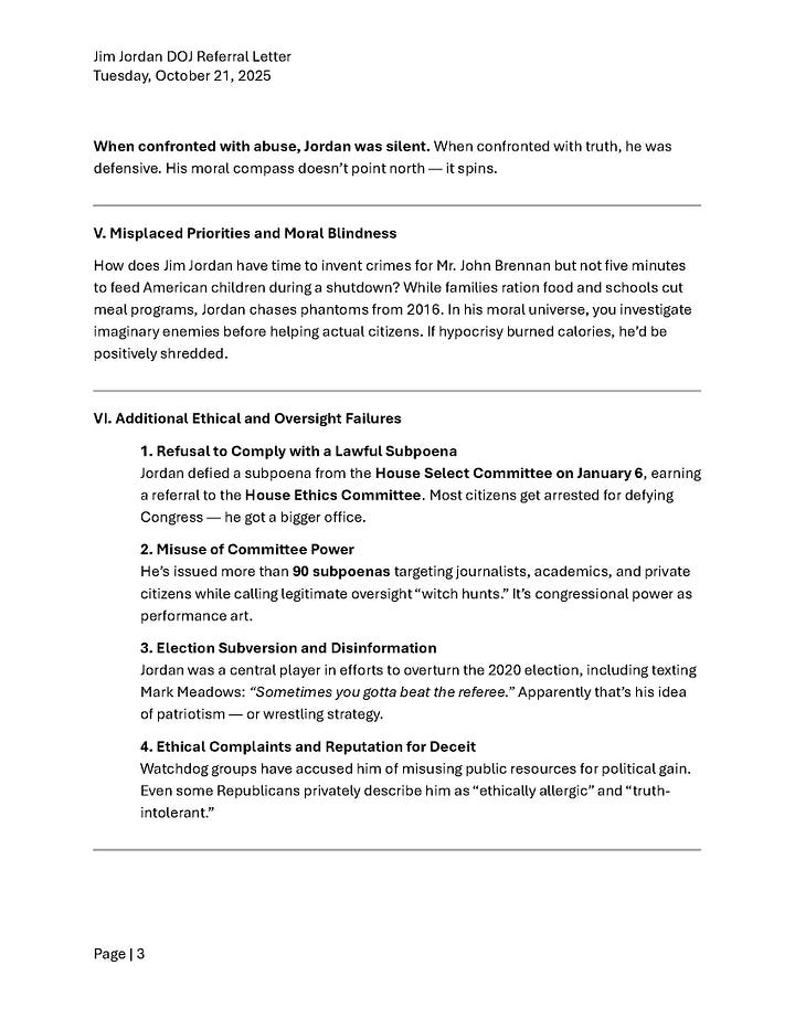 Just now, I officially referred Representative Jordan to the U.S. Department of Justice for:
