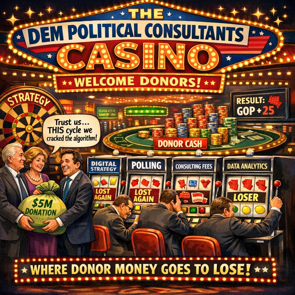 If a hedge fund blew client money cycle after cycle and still demanded seven-figure bonuses, heads would roll. If a CEO tanked company after company, they'd be blackballed. But in Democratic politics, the consultant class keeps getting richer off failure, literally millions vaporized in hopeless House races while they toast at D.C. happy hours and summer in the Vineyard. It's not incompetence; it's a business model. They thrive on the grift, not the wins.