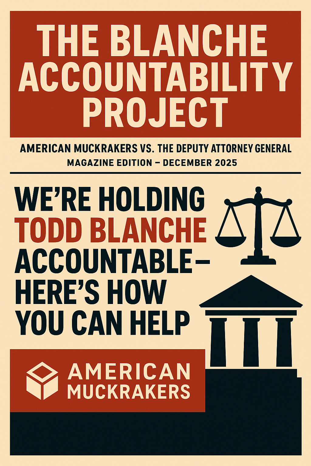 American Muckrakers has launched one of the most important accountability actions in our history — a coordinated legal strategy targeting the misconduct of Deputy Attorney General Todd Blanche, whose conflicts of interest and attacks on the justice system threaten the integrity of the Department of Justice itself.